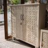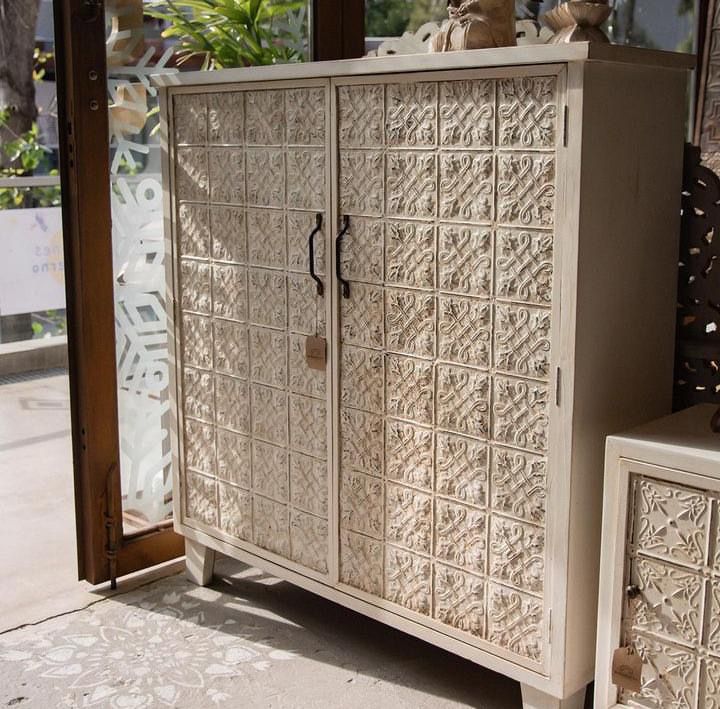 Armario Linea New York Blanco, fabricado en madera Pino taeda radial y chapas estampadas antiguas extraidas de viejos cielorrasos de New York. Contiene dos puertas con estantes.