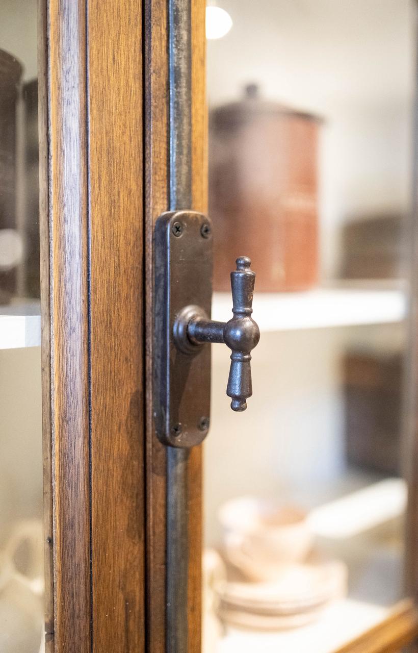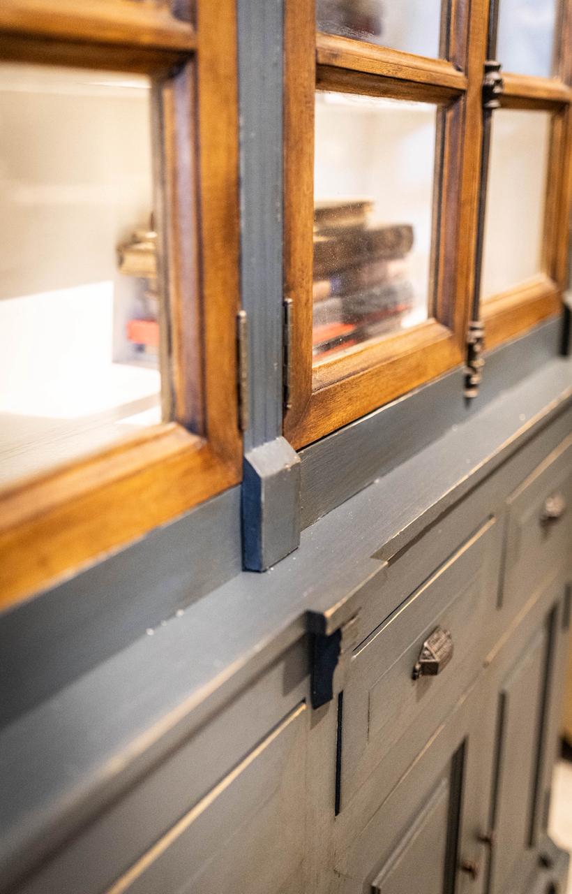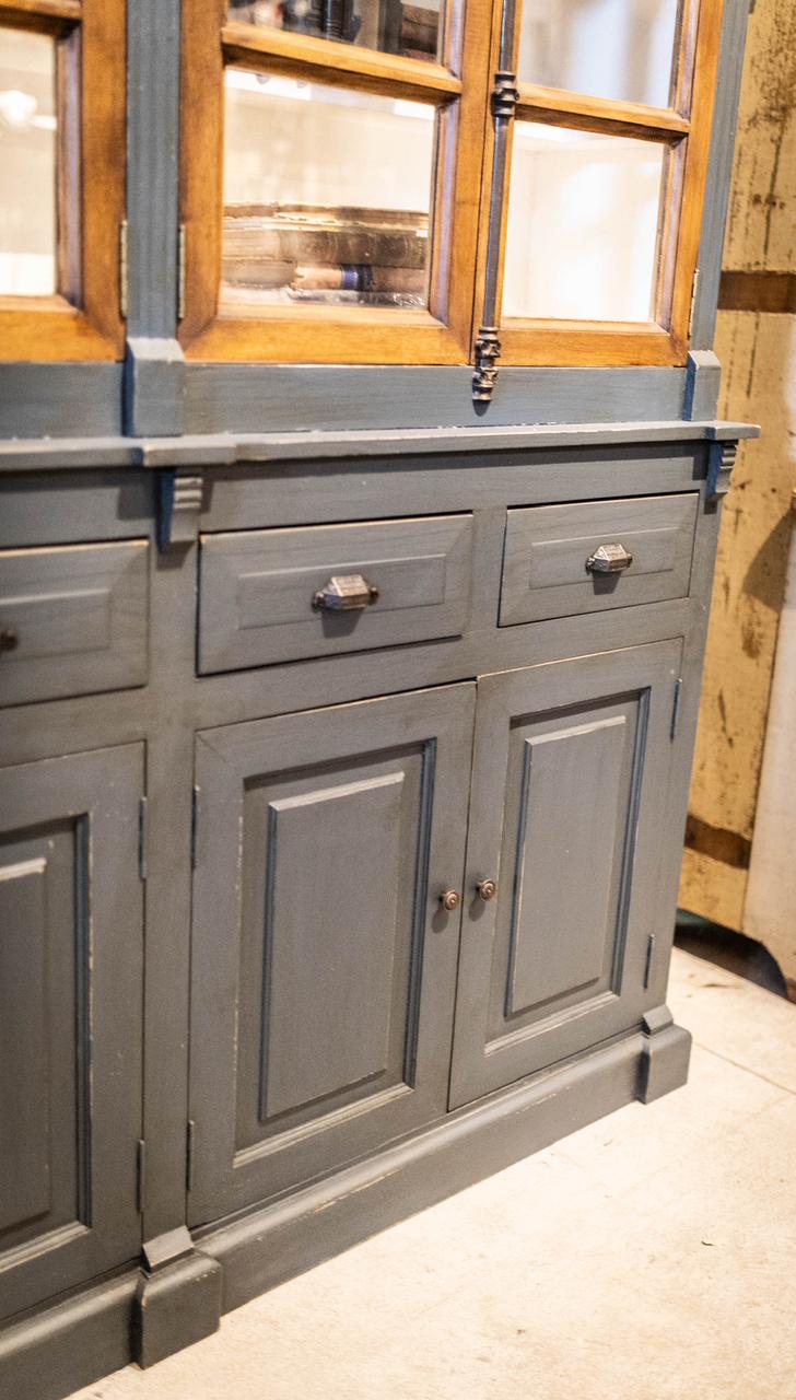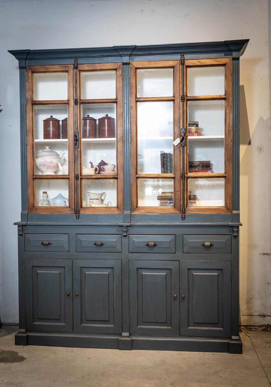 Contiene dos cuerpos con cuatro puertas vidriadas, cuatro cajones con herrajes Hamilton y cuatro puertas ciegas.