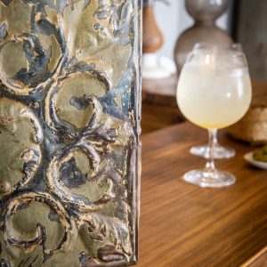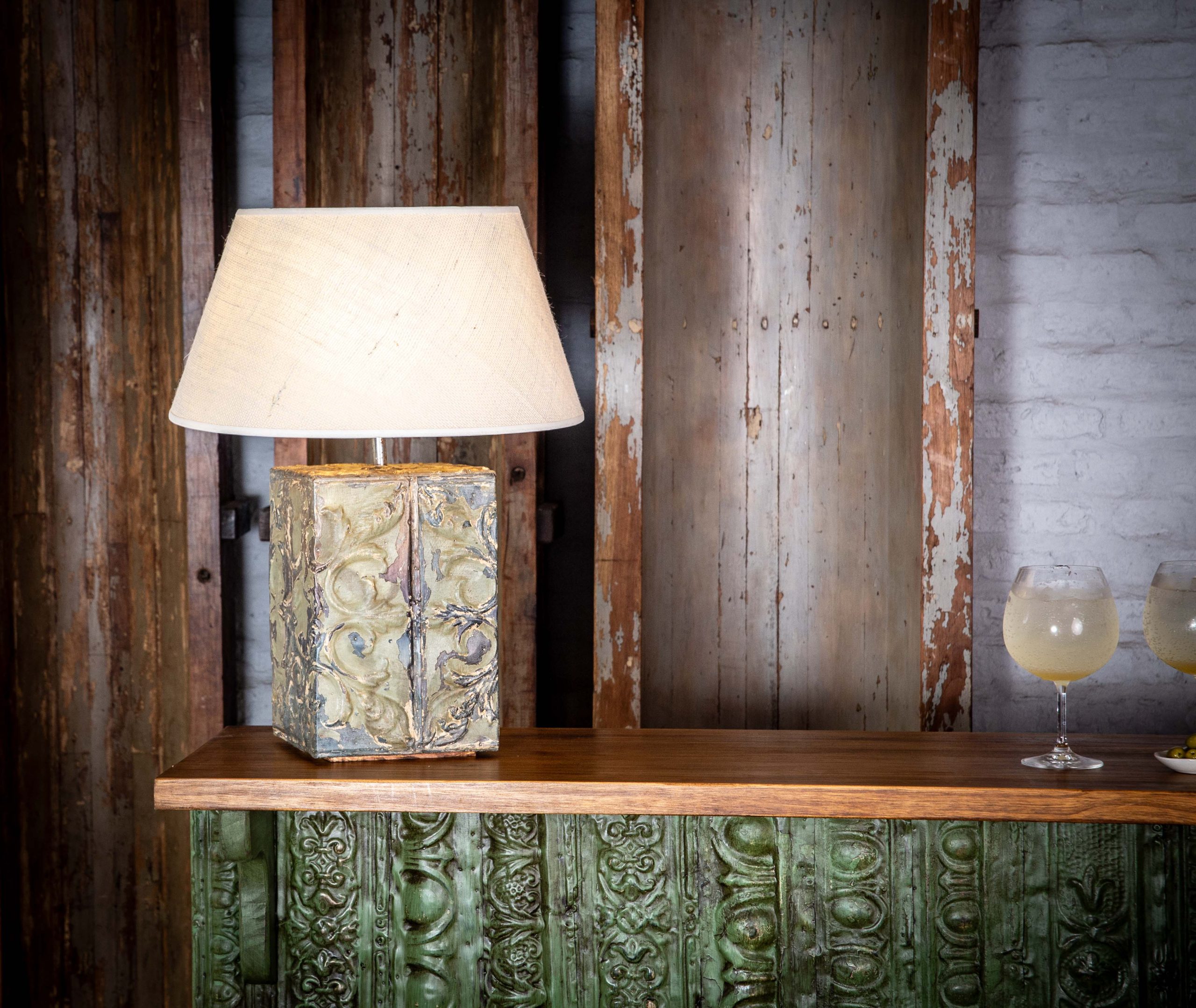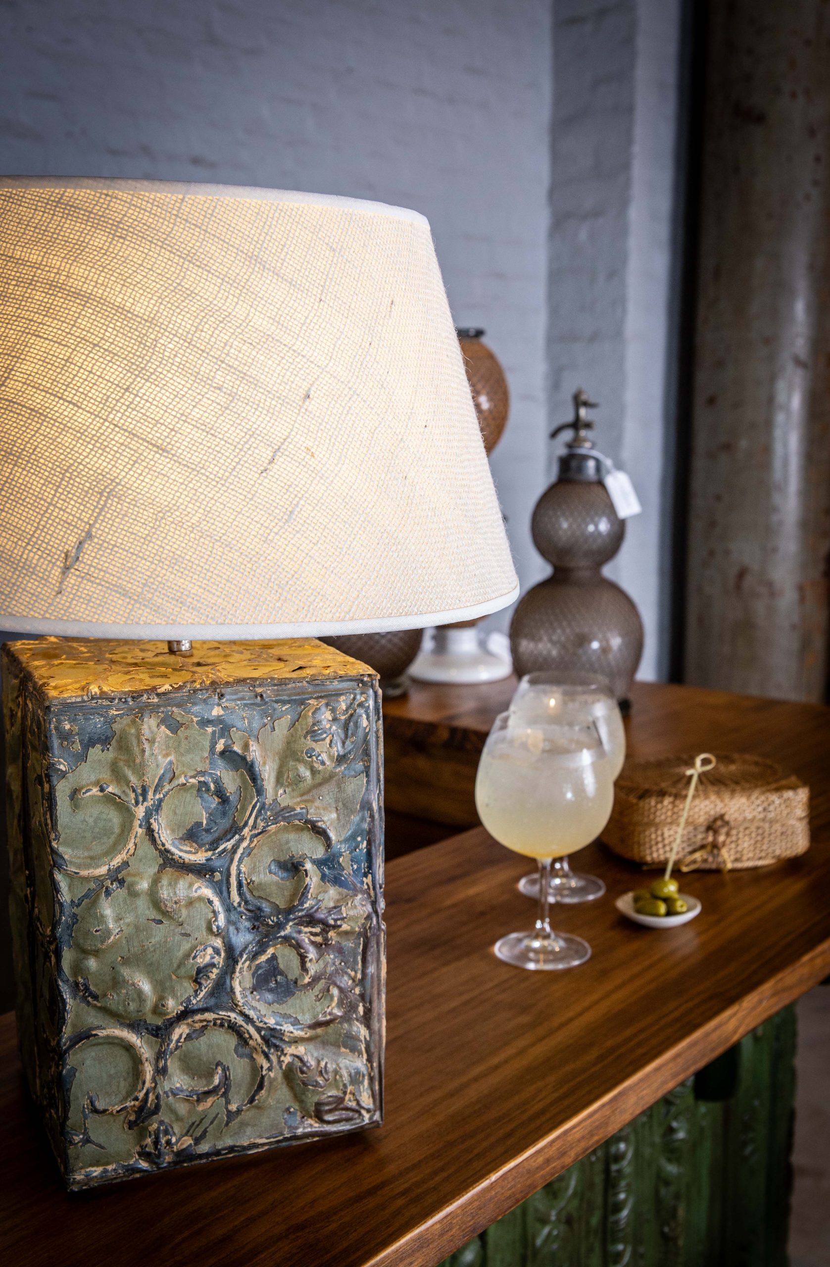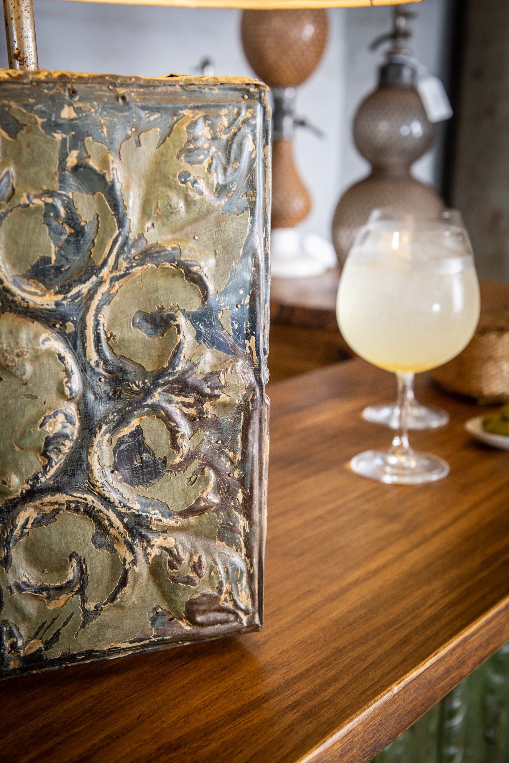 Fabricada con antiguas chapas estampadas recicladas de viejos cielorrasos de New York.
