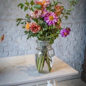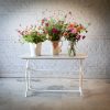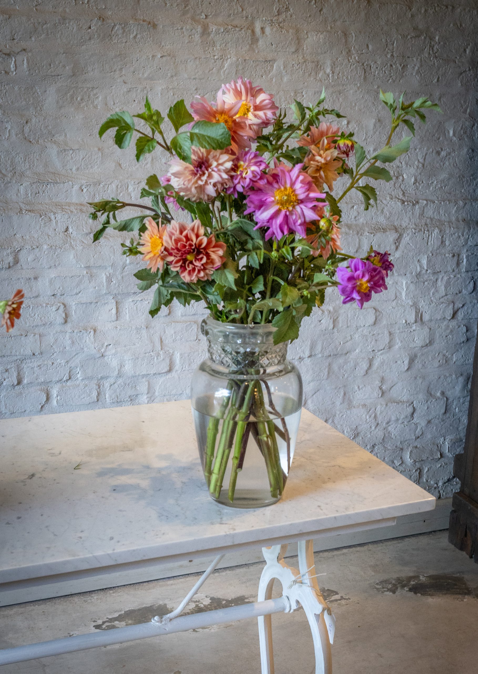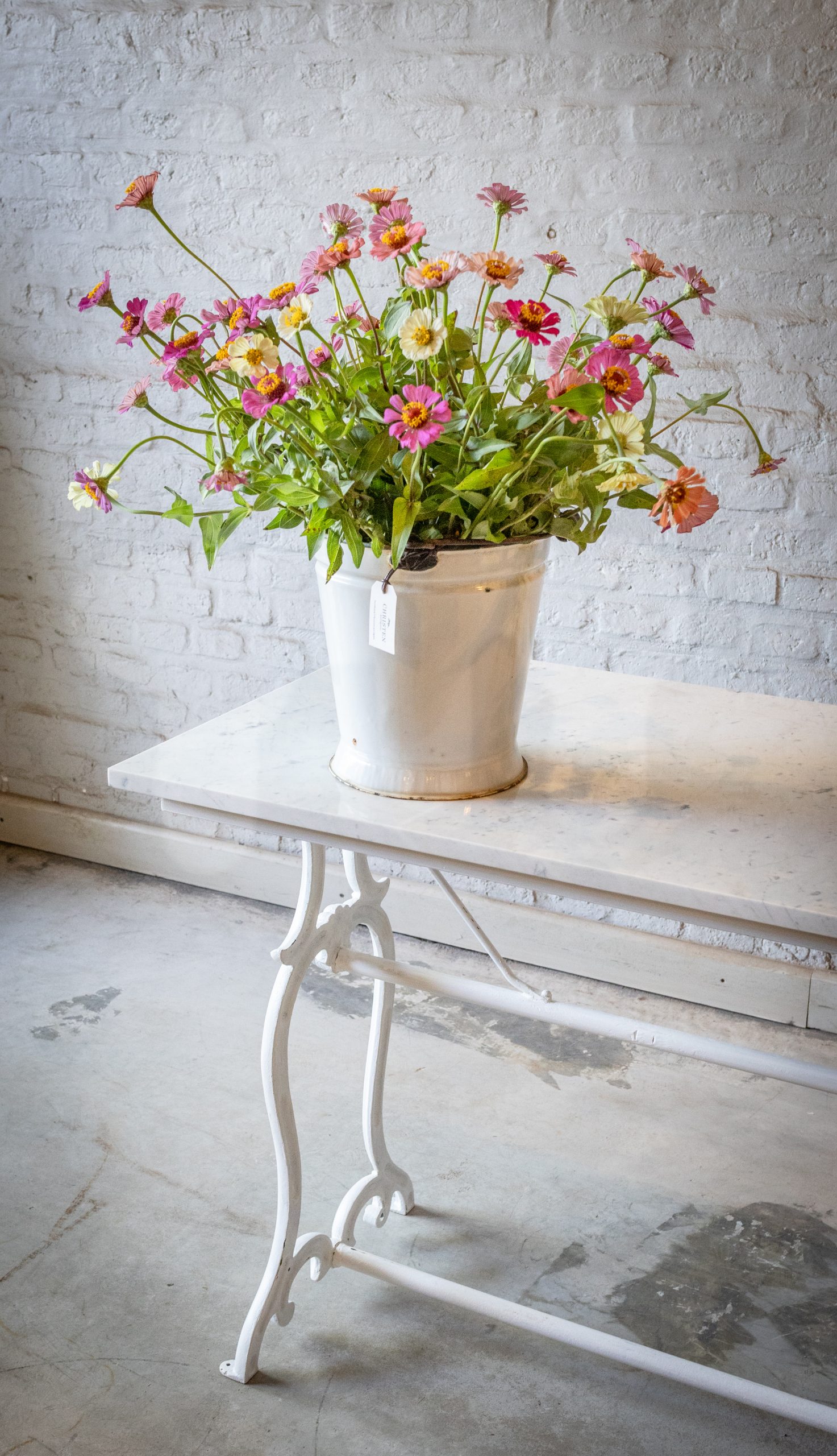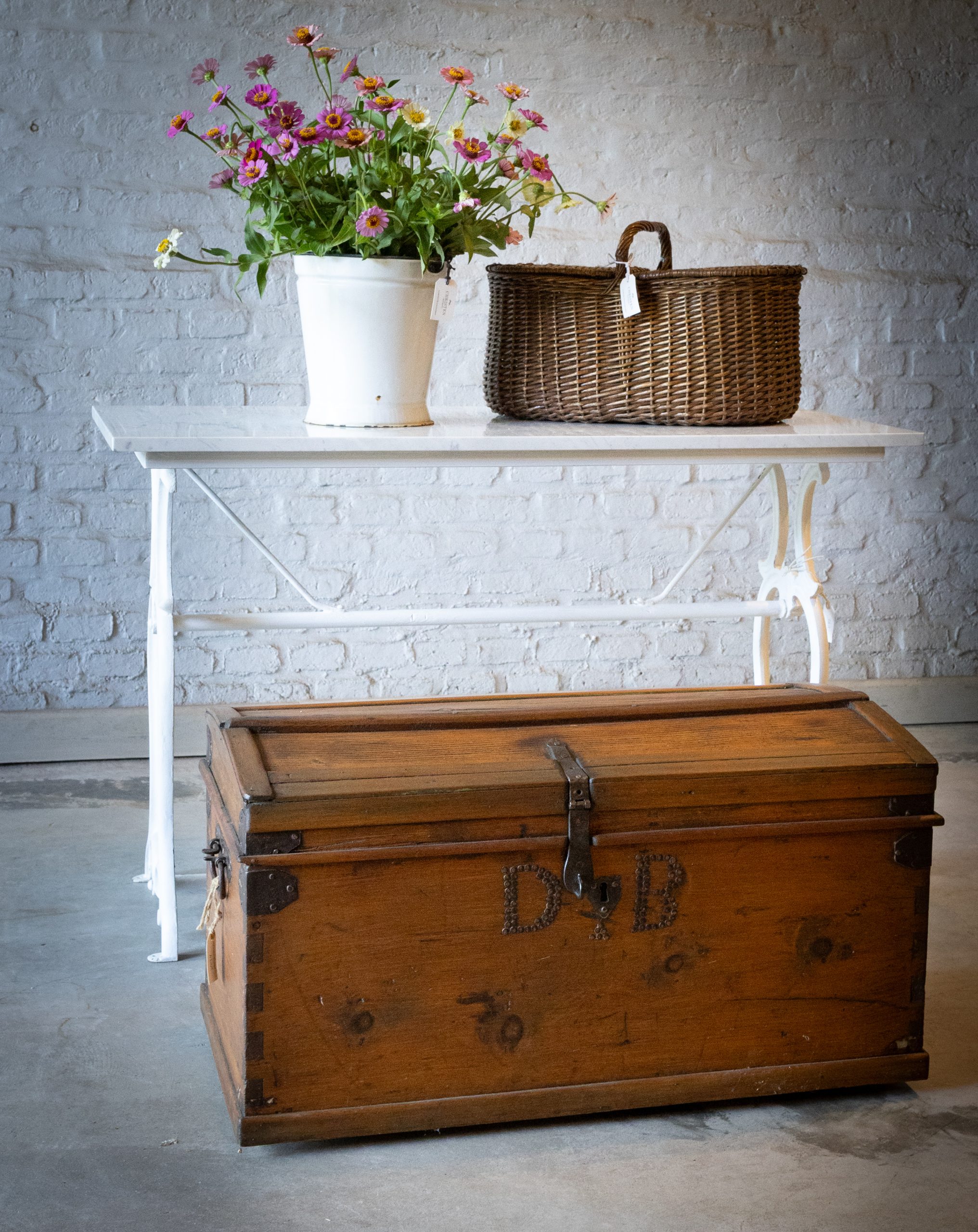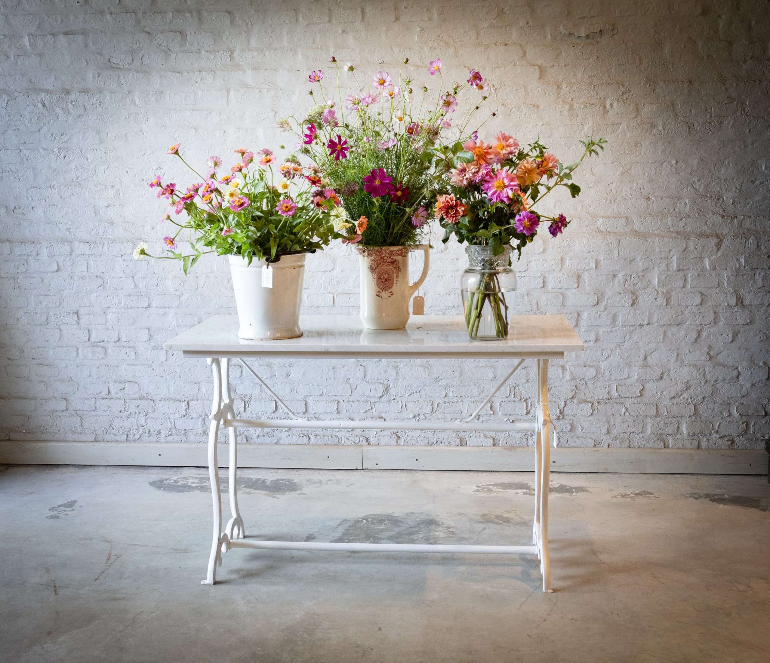 Fabricada con tapa de mármol de carrara y base de fundición en hierro antigua.