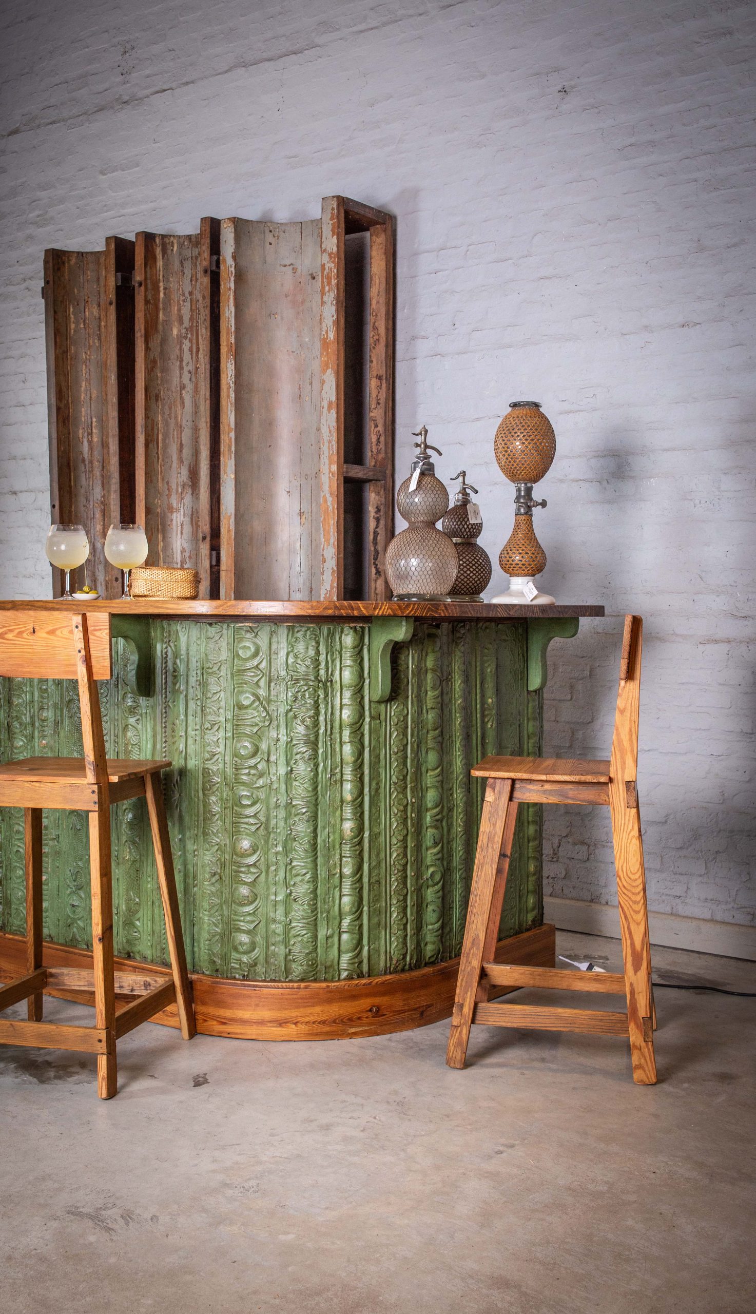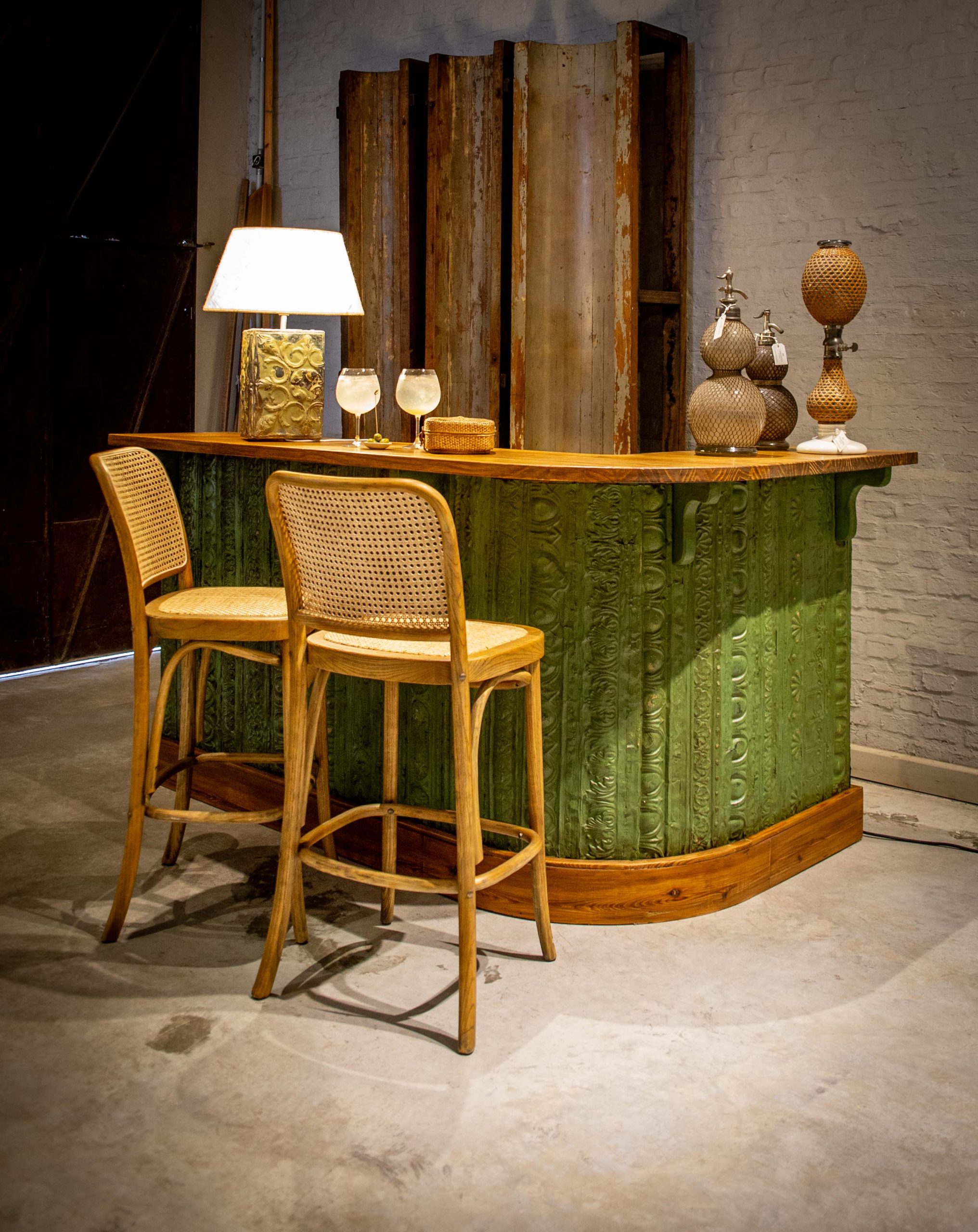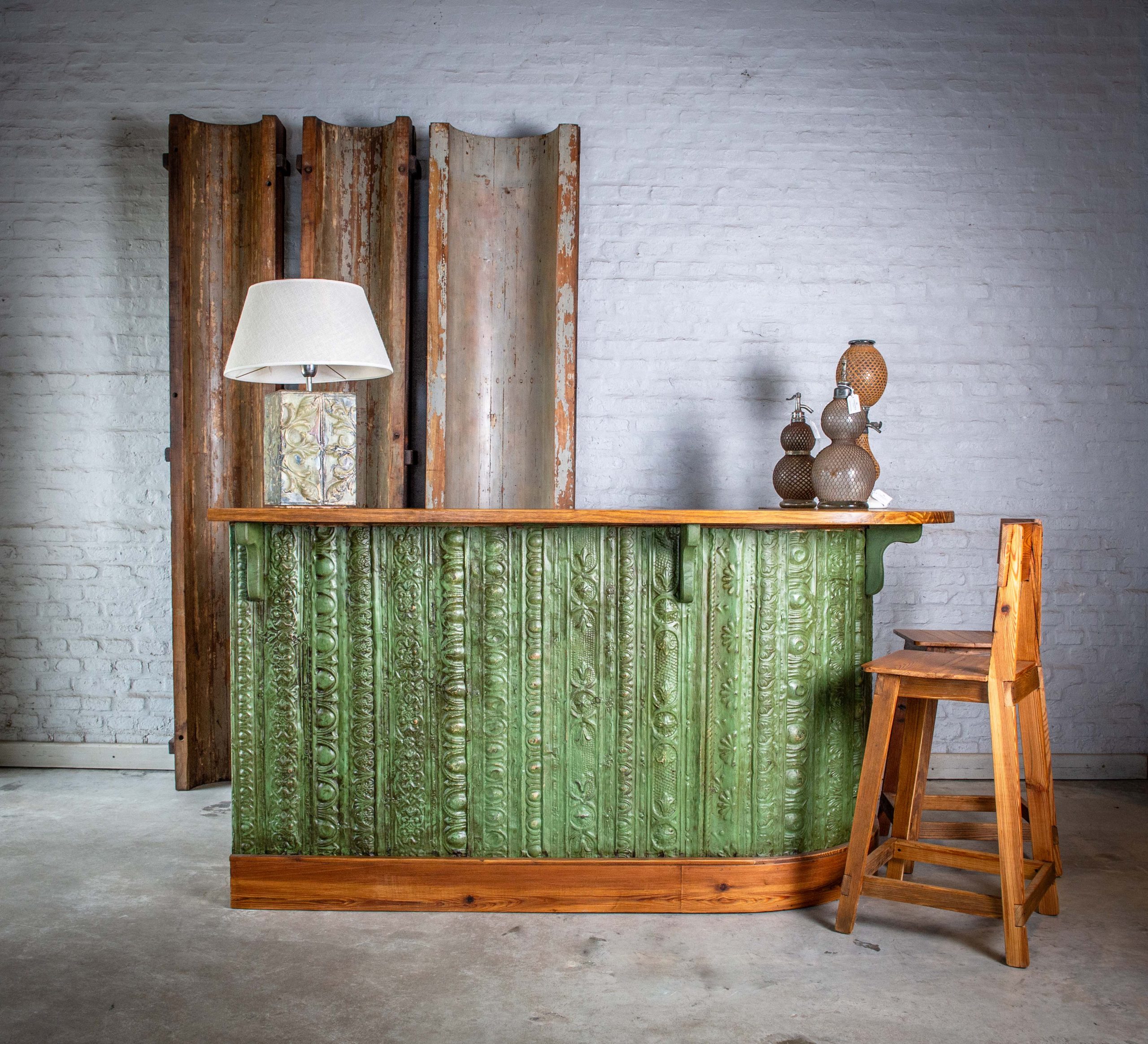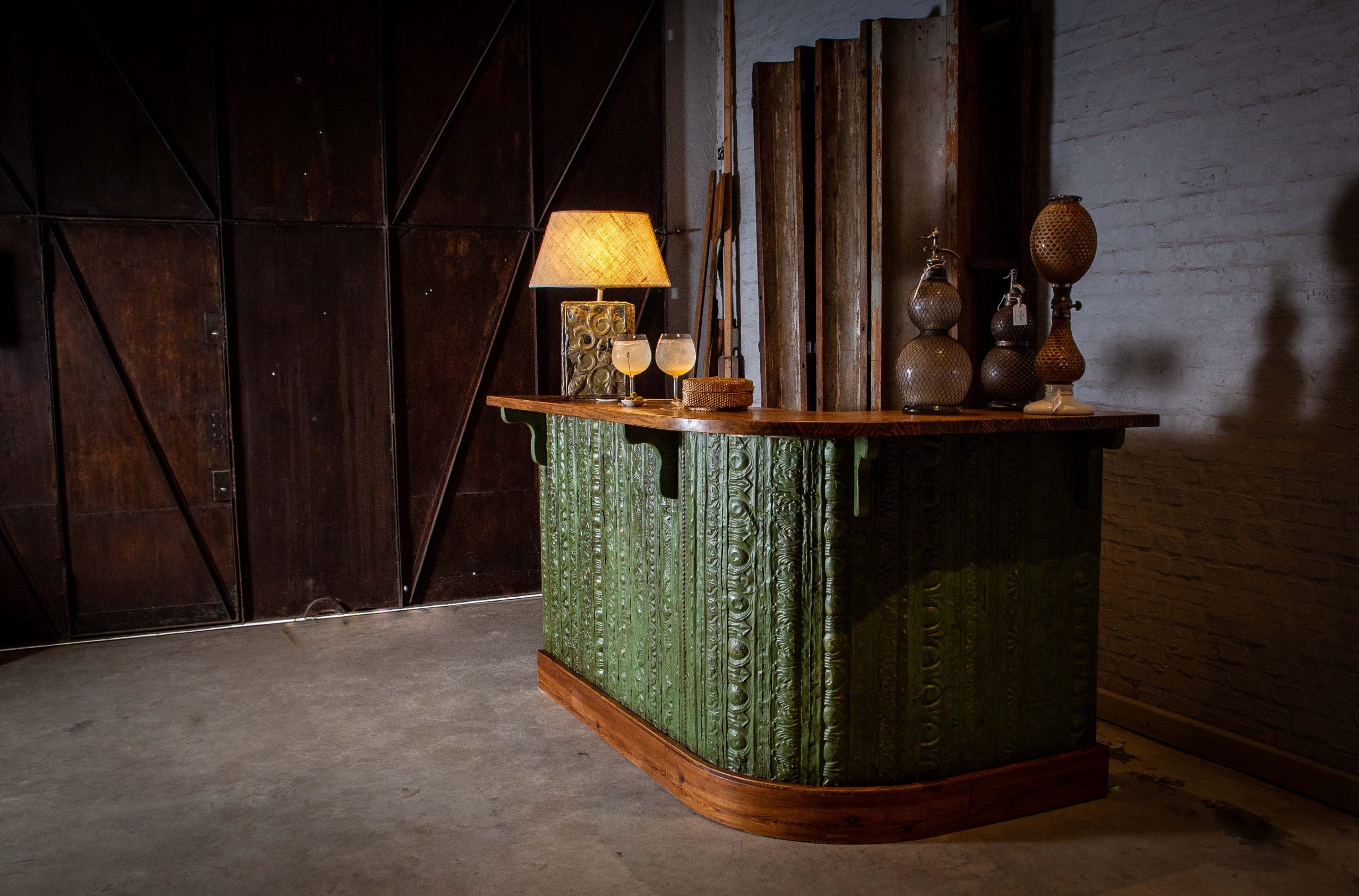 Barra/ mostrador curvado, fabricado en madera Pino Taeda radial y chapas estampadas antiguas extraídas de viejos cielorrasos de New York.