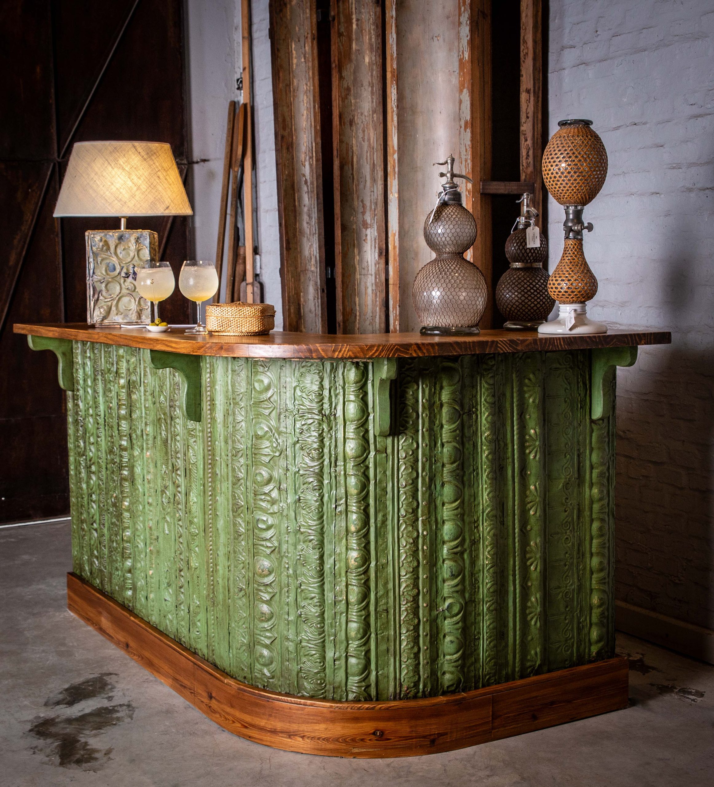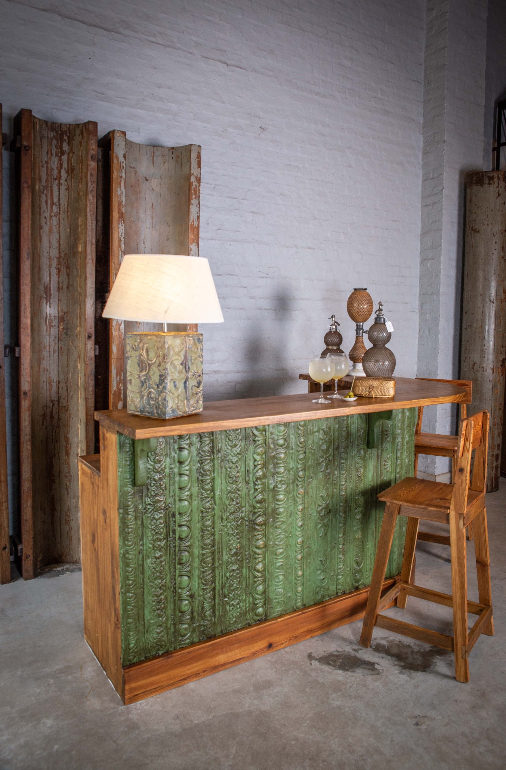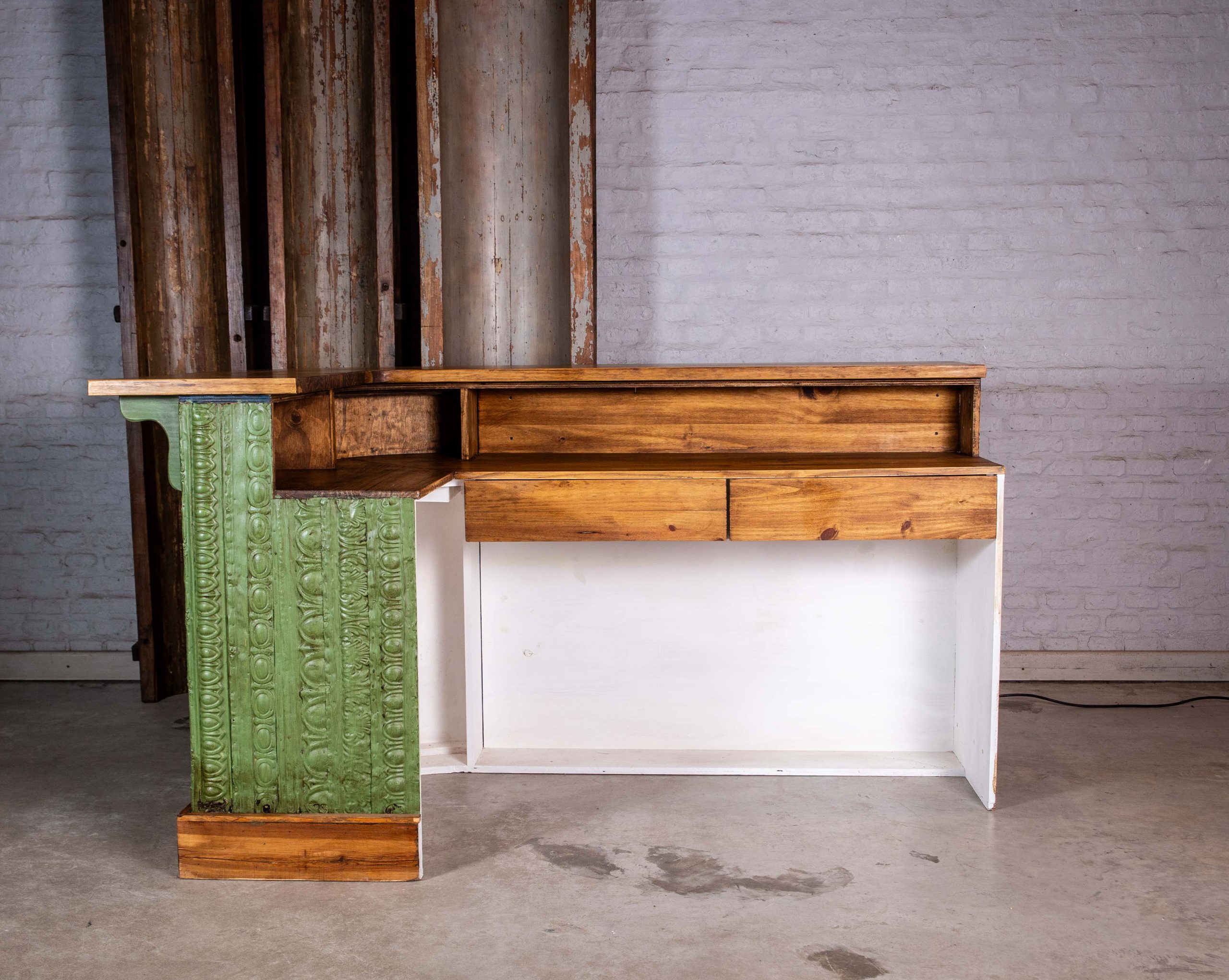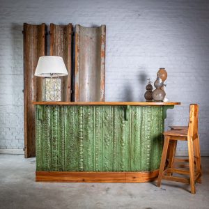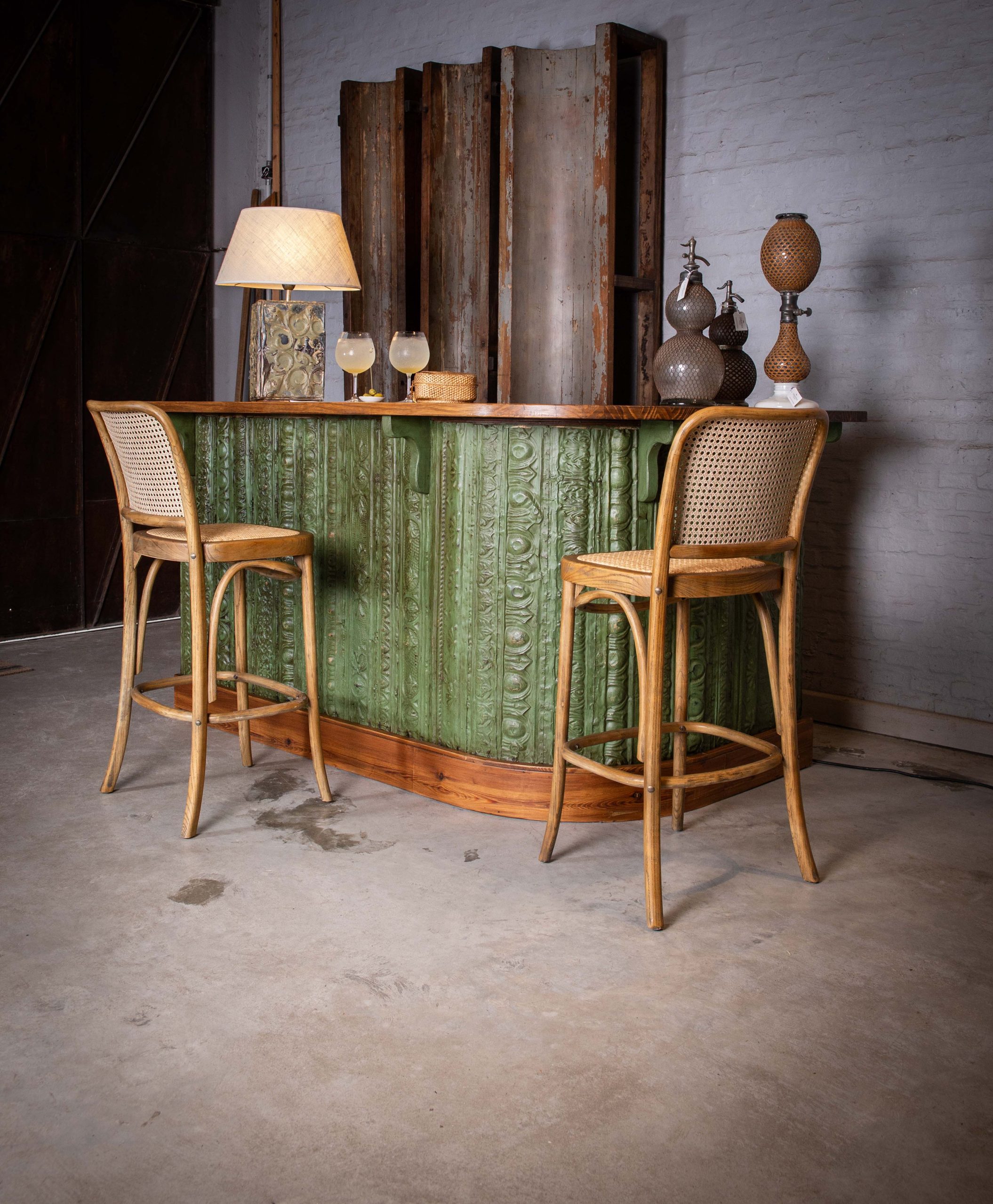 Barra/ mostrador curvado, fabricado en madera Pino Taeda radial y chapas estampadas antiguas extraídas de viejos cielorrasos de New York.