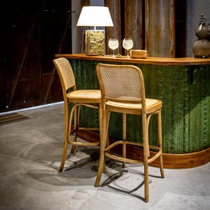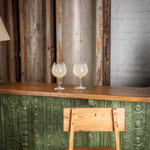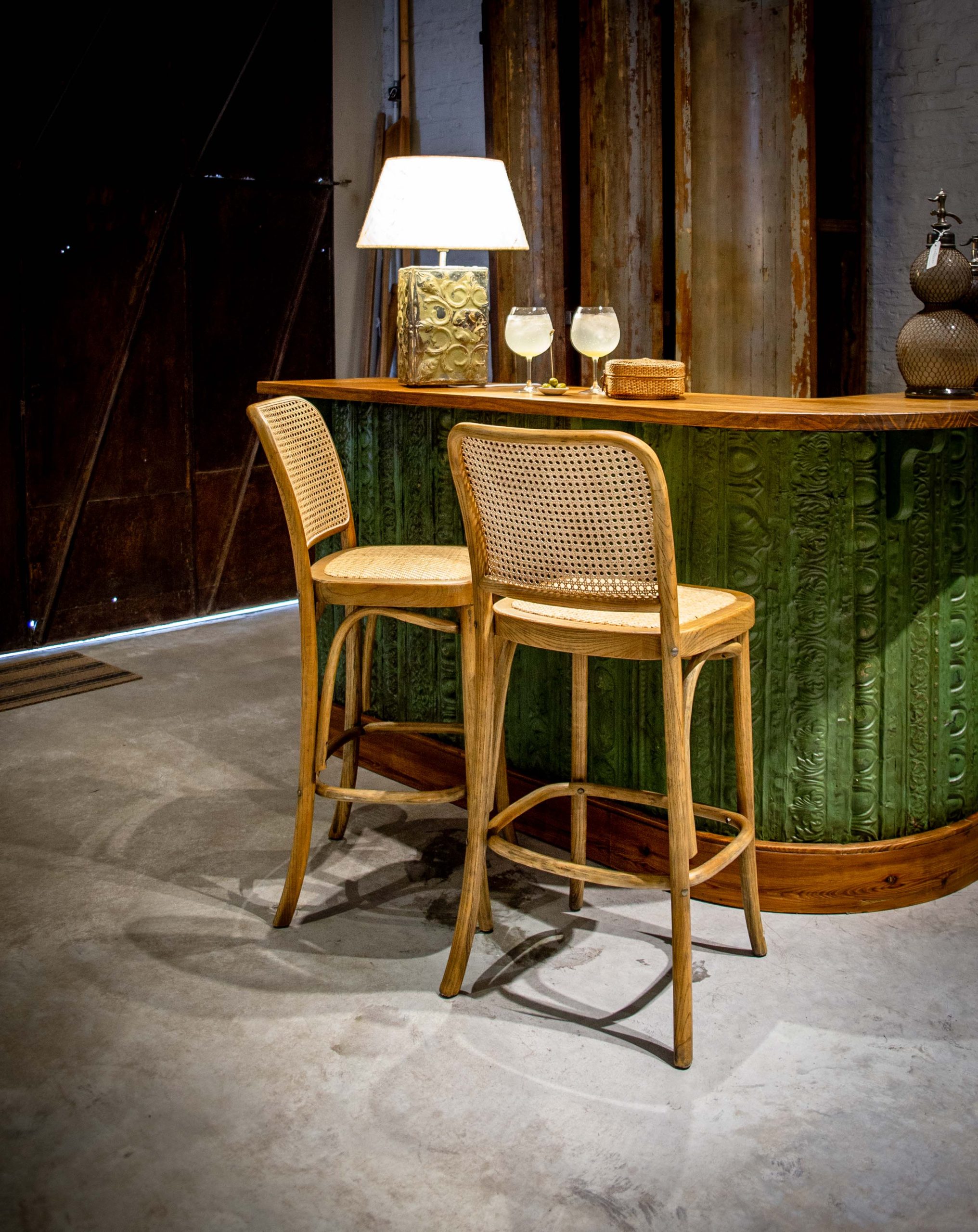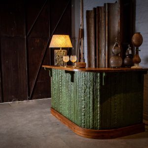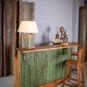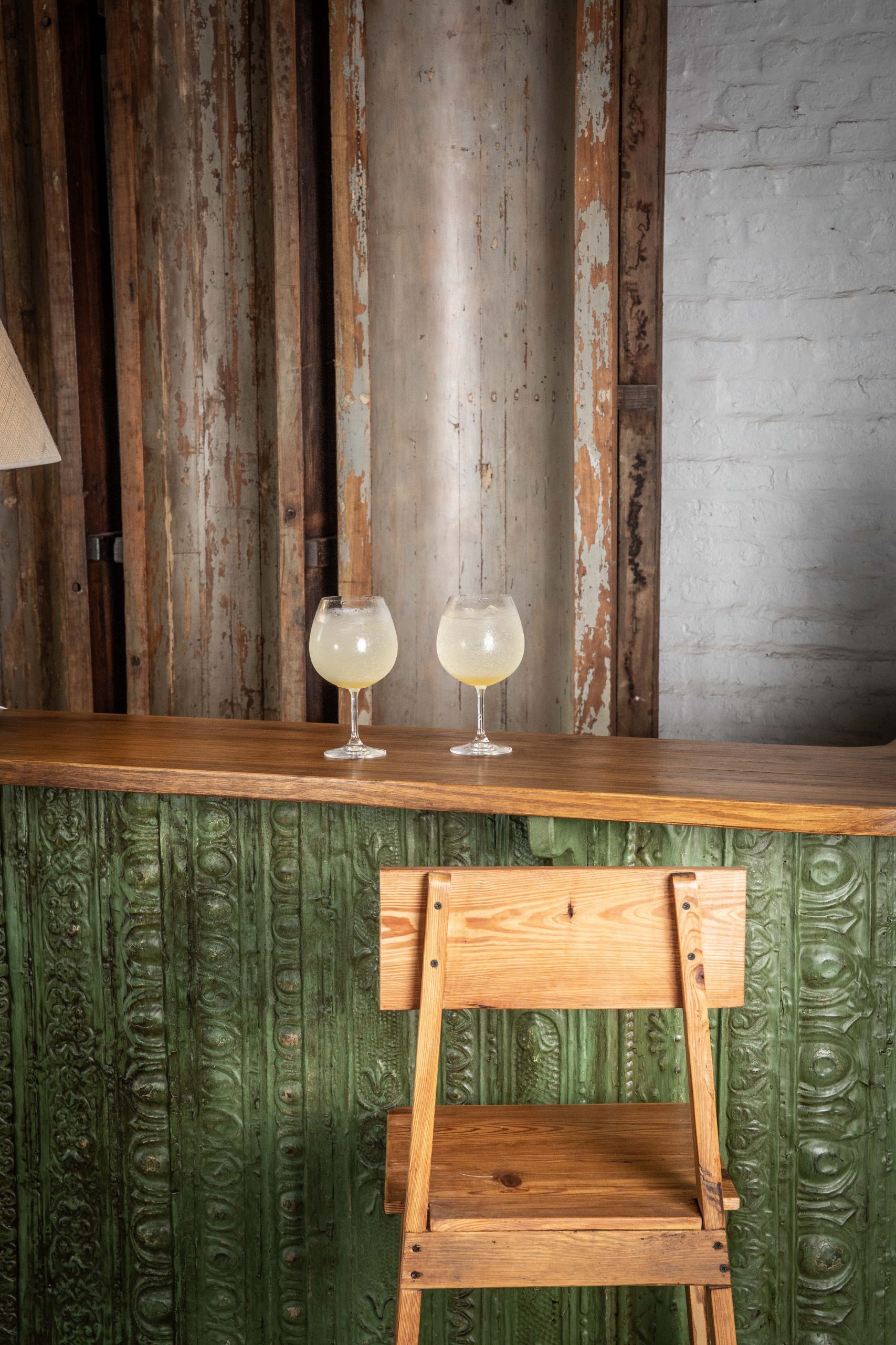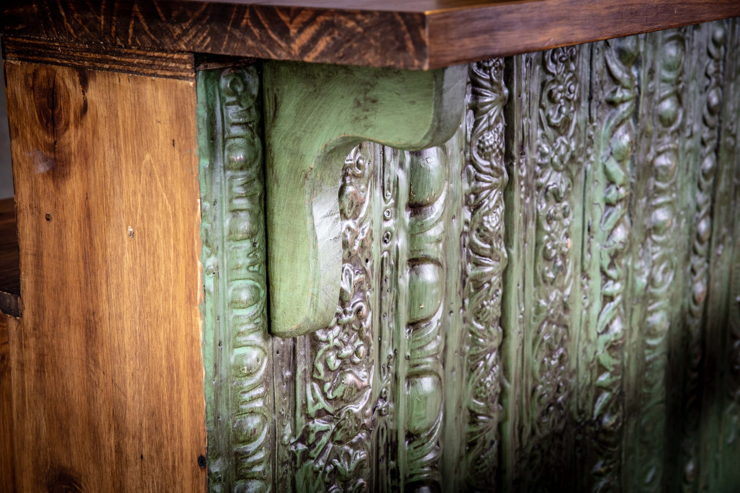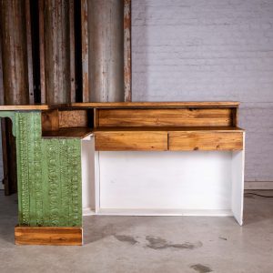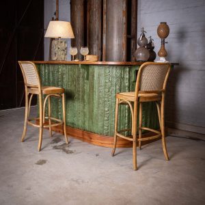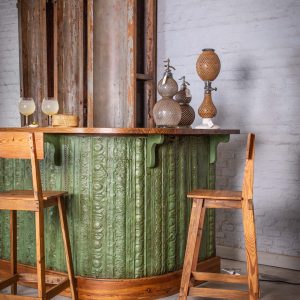 Barra/ mostrador curvado, fabricado en madera Pino Taeda radial y chapas estampadas antiguas extraídas de viejos cielorrasos de New York.