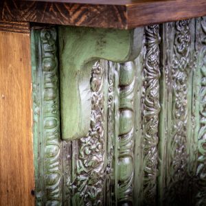 Contiene un lado ciego como vos me mencionaste y en lado interno contiene dos cajones y espacios de guardado.