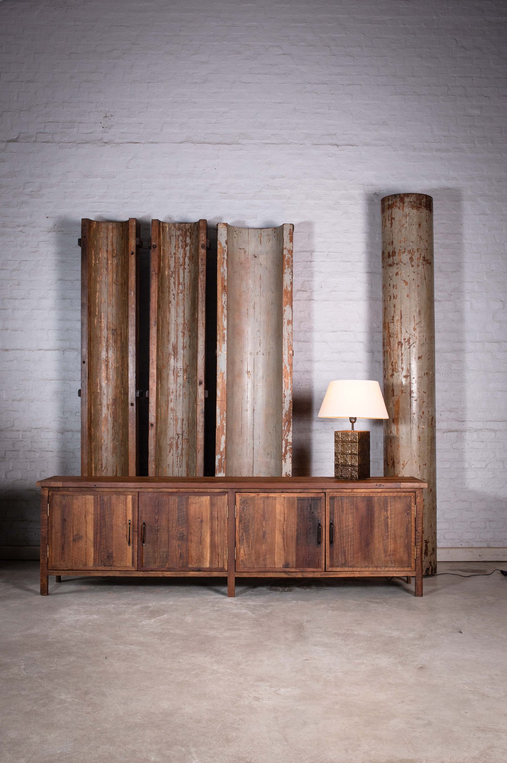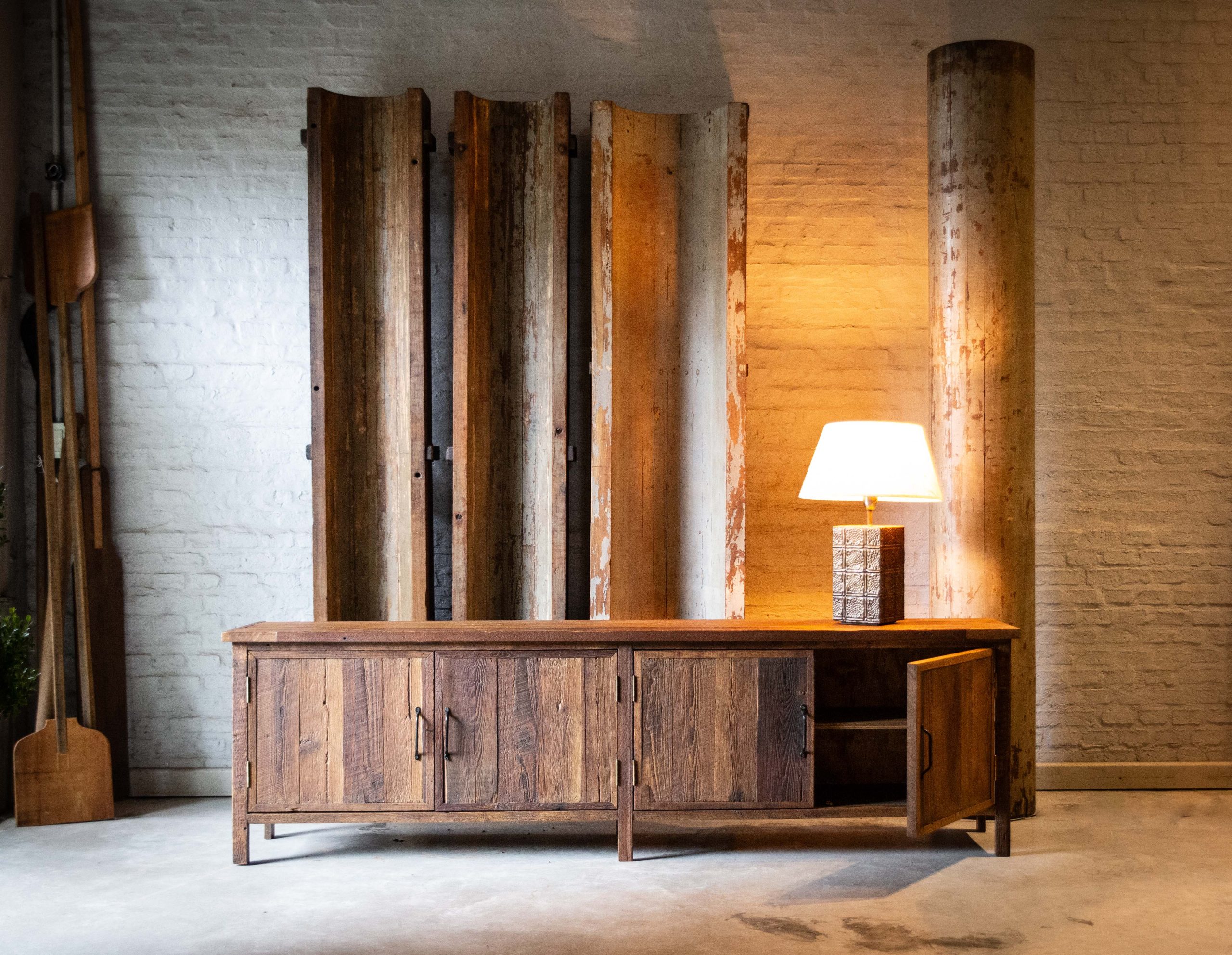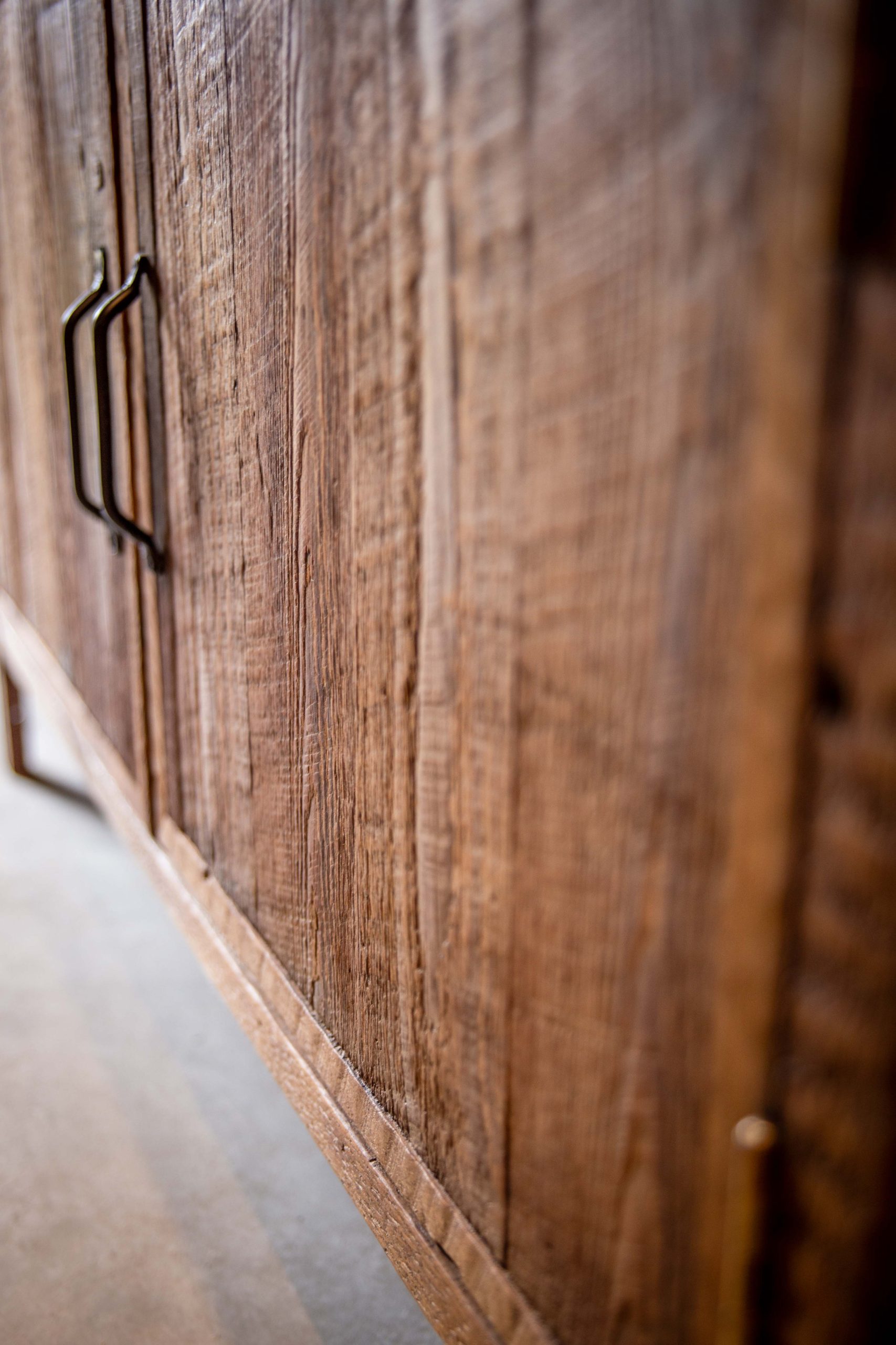 Contiene cuatro puertas ciegas y estantes interiores, ideal para usar como rack TV.