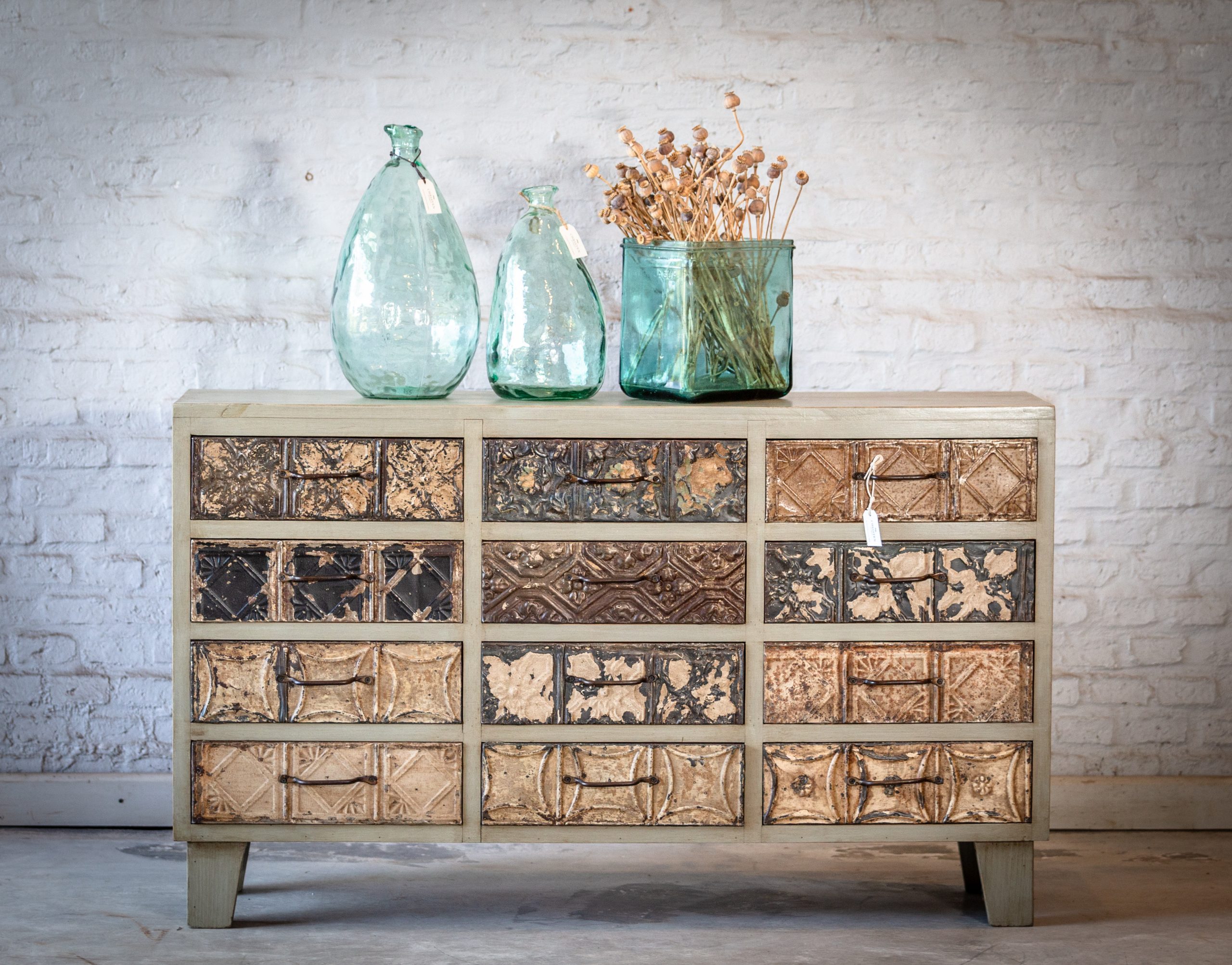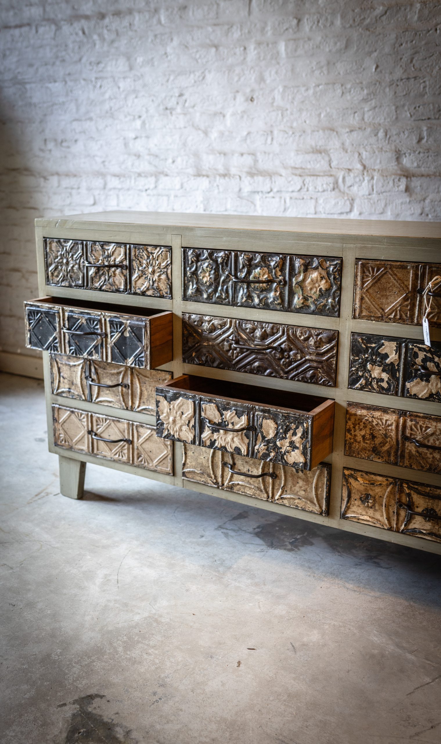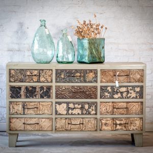 Linea de mueble Drawers – fabricada en Pino Taeda radial, contiene doce cajoncitos forrados en antiguas chapas estampadas –