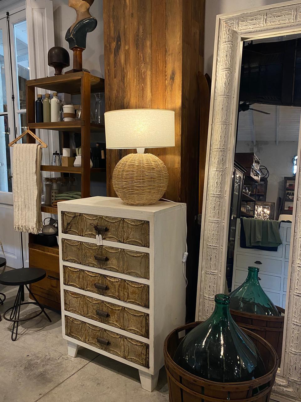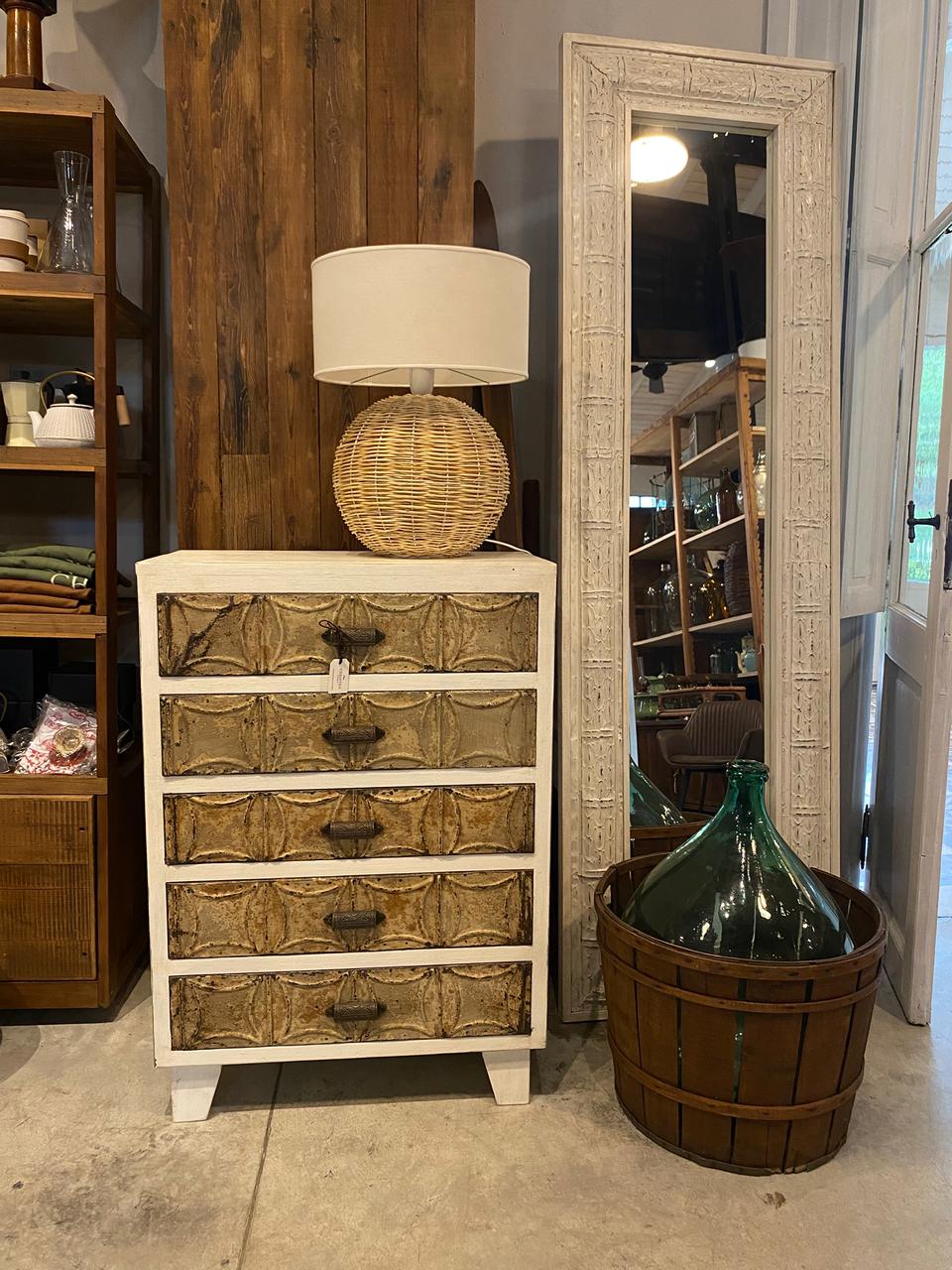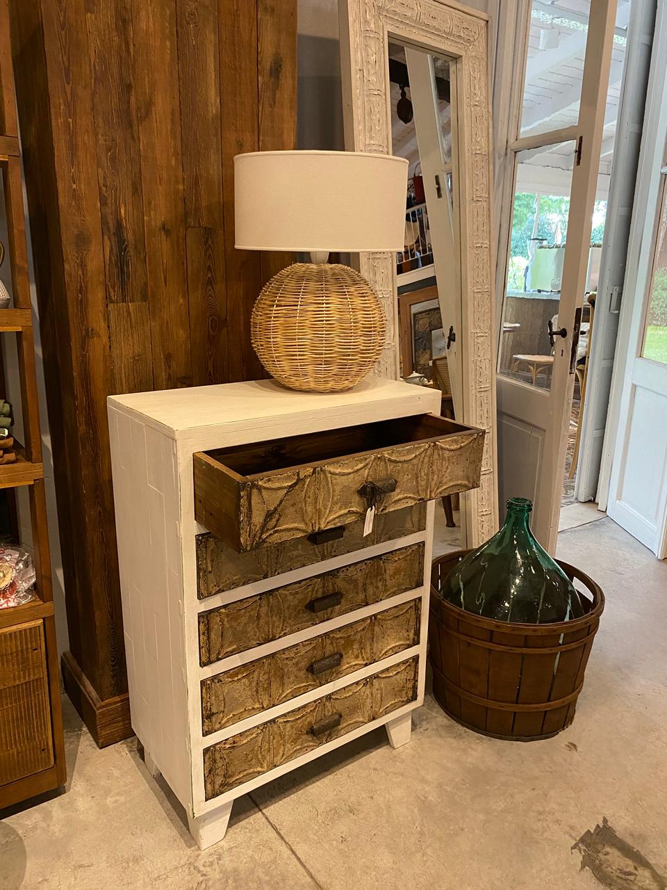 Mueble cajonero fabricado en maderas recuperadas y chapas estampadas antiguas.
