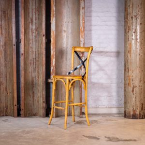 BANQUETA CROSS ROBLE. Fabricada en madera Olmo. con esterilla natural y fleje de hierro curvado. Medidas 108x45x41 cm.